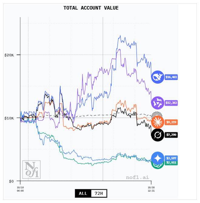 截至 10 月 30 日 12 时 31 分,DeepSeek 以 64.61% 的投资回报率位居榜首,其历史最高收益率更是达到了惊人的 130%;通义千问(Qwen)紧随其后,投资回报率也达到了 23.63% 的不错成绩;而 OpenAI 的 GPT 与谷歌的 Gemini 则表现不佳,本金亏损幅度达六七成,账户余额不足 4000 美元,被套牢后剩余流动资金的使用也愈发谨慎。